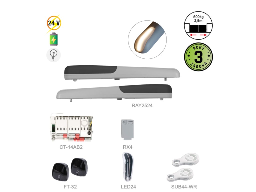 900KRAY2524ER - RAYKIT pro dvojkrídlovú bránu do 2,5m/krídlo., 2x RAY2524 pohon 24V, 85W, 1500N, 1x LED24, 2x SUB-44WR, 1x CT-14A, 1x RX4, 1 pár FT-32