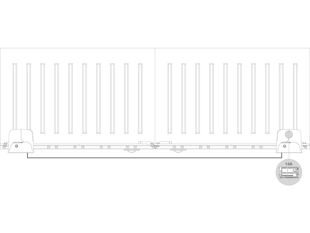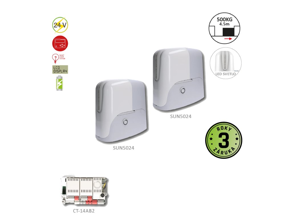 900KSUN5024TW pre protichodné posuvné brány do 500 + 500 kg, 2x SUN5024 (24 V, 250 W, 18 Nm), 1x CT-14A, Nutné dokúpiť prijímač a vysielač.