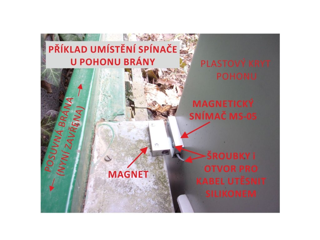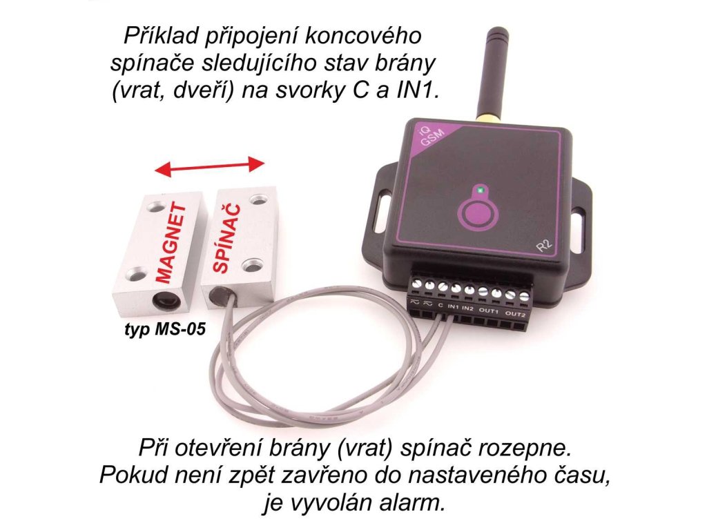 Alarm možno využiť aj pri bránach s manuálnym otváraním, bez pohonu! Napájať potom možno adaptérom. Funkcie ovládania a alarmu sú oddelené, fungujú aj samostatne. Snímač detekuje stav brány. či je otvorená alebo zatvorená. Keď je čas otvorenia dlhší ako ste si nastavili (nastaviteľné v rozsahu 1s - 24h), majiteľ obdrží alarmové volanie, ktoré ho upozorní na závadu, neuzavretie alebo narušenie. Po pripojení GSM kľúča k vášmu pohonu, umiestnite koncový spínač na bránu, pomocou vodiča (dvojlinky) pripojte spínač k iQGSM-R2. Na vstupy IN1 a IN2 možno pripojiť iba kontakty spínača, sú určené pre pripojenie koncových spínačov a snímačov (nie pre prívod napätia)! Koncové spínače nie sú súčasťou dodávky. Spínač s označením GSA03 je magnetický vodotesný typ spínača v robustnom kovovom tele pre vonkajšie použitie (v ponuke Kovian).