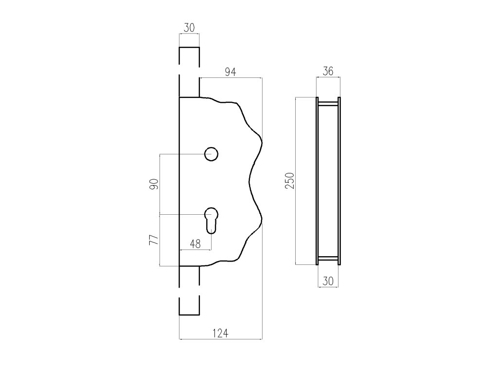 Kazetová zostava pre bránku 250x125x30mm, otvor pre kľučku ø 20mm, na profil 30x30mm, zdobená, pre zámok ZM90/80