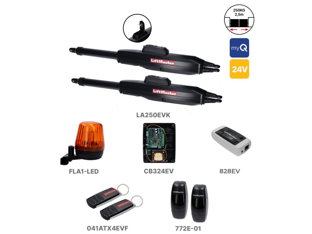 LiftMaster LA250EVK-03 je kompletná sada pohonov pre rezidenčné krídlové brány so šírkou krídla do 2.5m na každé krídlo. Tento moderný pohon podporuje technológiu myQ, ktorá umožňuje ovládanie brány odkiaľkoľvek na svete prostredníctvom smartfónu, tabletu alebo počítača. Vďaka svojej odolnej konštrukcii a vysokej spoľahlivosti je ideálnym riešením pre bezpečnú a komfortnú prevádzku brány.Hlavné vlastnosti