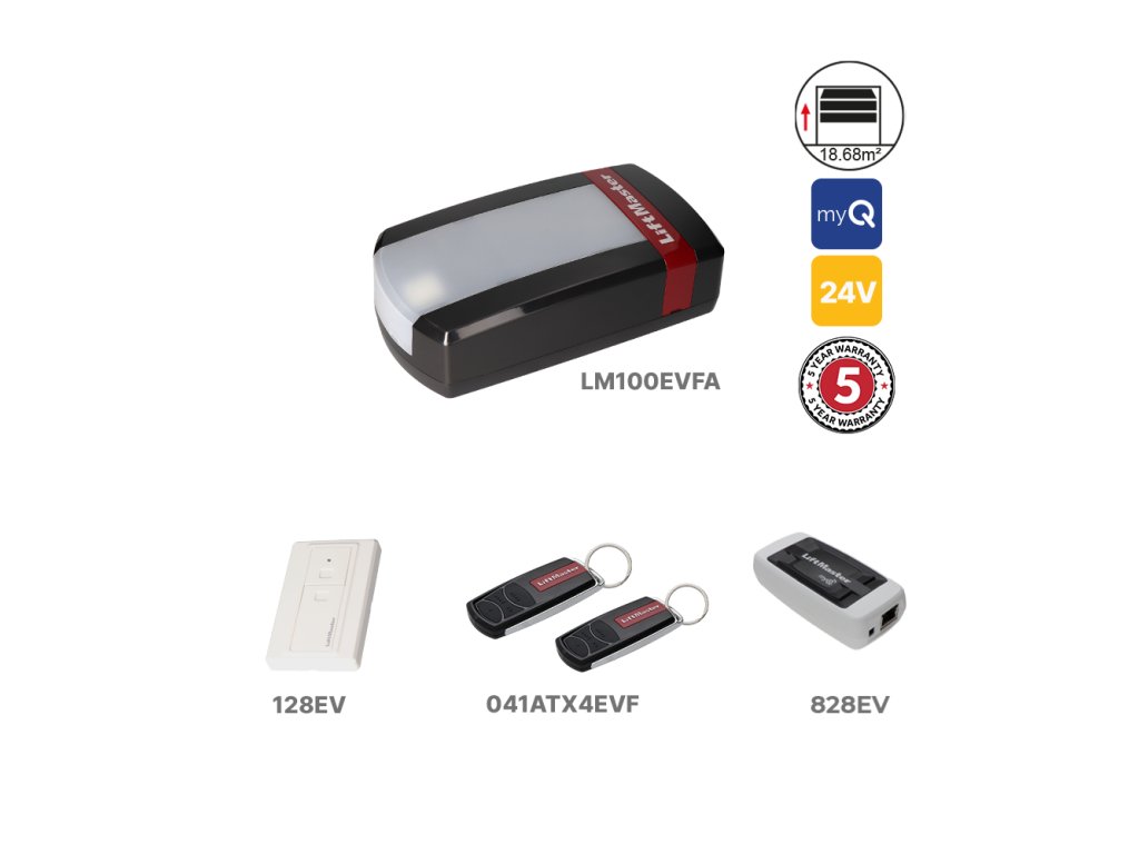 LiftMaster LM100EVFA je výkonný 24 V pohon určený pre garážové sekčné brány s hmotnosťou do 150 kg a maximálnymi rozmermi 5,75 m (šírka) × 3,25 m (výška). Vďaka rýchlosti otvárania a zatvárania 200 mm/s ide o jeden z najrýchlejších pohonov vo svojej triede. Navyše, s predĺženou zárukou 8 rokov na elektromotor získavate maximálnu spoľahlivosť a dlhodobú istotu.Moderný, kompaktný dizajn s integrovaným LED osvetlením dopĺňa pokročilá technológia myQ smart home, ktorá umožňuje ovládanie brány odkiaľkoľvek cez smartfón, tablet alebo počítač (vyžaduje internetovú bránu 828EV – je súčasťou balenia).