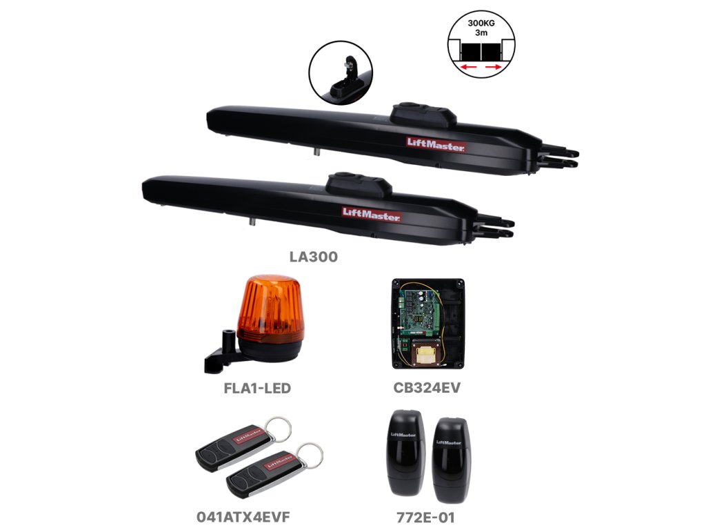 LiftMaster LA300EVK-03 je kompletná sada pohonov pre rezidenčné krídlové brány so šírkou krídla do 3m na každé krídlo. Tento moderný pohon podporuje technológiu myQ, ktorá umožňuje ovládanie brány odkiaľkoľvek na svete prostredníctvom smartfónu, tabletu alebo počítača. Vďaka odolnému dizajnu a spoľahlivosti je ideálnym riešením pre komfortnú a bezpečnú prevádzku brány.Hlavné vlastnosti