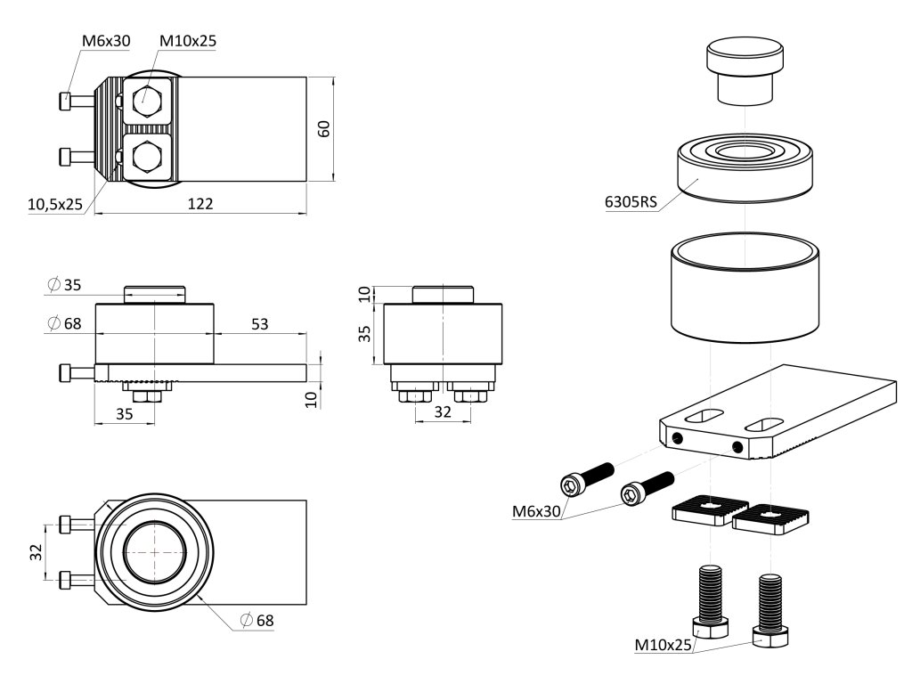 Ložiskový záves ø 68 mm, M10 x 25 mm