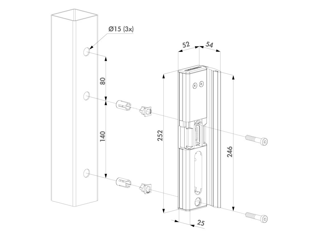 Elektrický zámok LOCINOX® MODULEC SA vo verzii E (Emissa - Fail Close). Privedením napájania sa zámok odblokuje a pri výpadku napájania zámok zostáva zablokovaný. Napájanie 12V - 24V aj AC/DC. Zámok je univerzálny pre ľavé aj pravé otváranie a je určený na povrchovú montáž na profil 40 až 60 mm. Kryt a lišta zámku sú vyrobené z hliníka, zapadací plech je z nehrdzavejúcej ocele, v lište je integrovaný gumený tlmiaci pásik.
