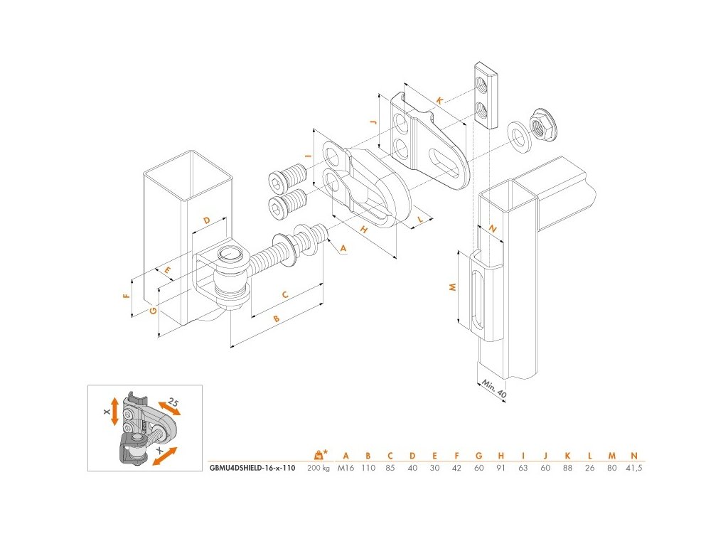 Po inštalácii je nastaviteľný v troch-smeroch. Nastavením závesu docielite súbežnosť vyosených krídiel (napríklad vyosenie stĺpika vplyvom mrazu). Záves umožňuje reguláciu 25 mm na šírku (X),.19 mm na výšku (Y) a 53 mm na hĺbku (Z).