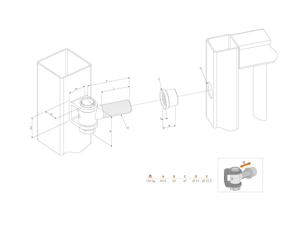 Záves 90° otvárateľný, navárací, so zvýšenou ochranou (ANTIVANDAL prevedenie ). Záves je určený pre všetky malé a priemyselné krídlové brány. Nastaviteľný je 30mm na širku (X).