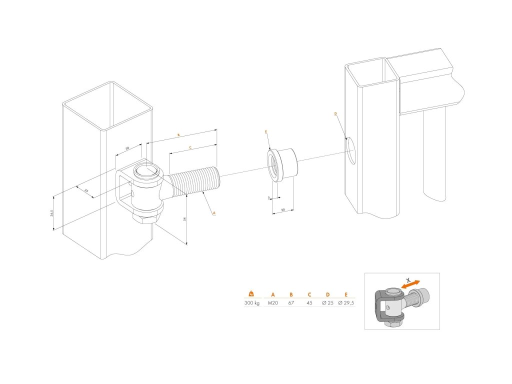 Záves 90° otvárateľný, navárací, so zvýšenou ochranou (ANTIVANDAL prevedenie ). Záves je určený pre všetky malé a priemyselné krídlové brány. Nastaviteľný je 27 mm na širku (X).