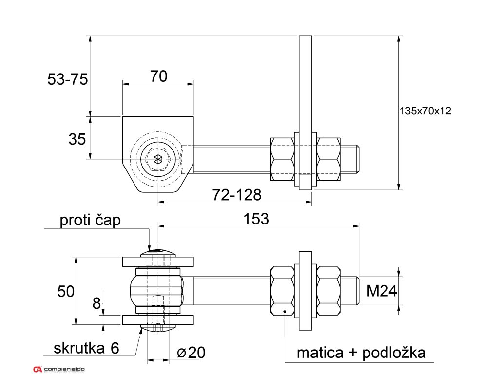 Regulovateľný, navárací bočný záves-pant, závit M24od popredného talianského výrobcu Combi Arialdo. Povrchová úprava- pozink, 2x časť v tvare D /prizvára sa na krídlo brány/ a časť v tvare I /prizvára sa na stĺp/ - bez povrcovej úpravy. Použitie pre ľahké brány.