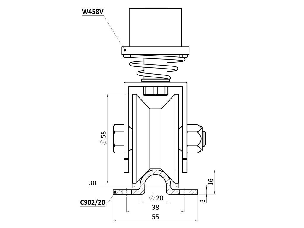 Otočné vodiace koliesko použiteľné pre U profily s ø20. Použiteľné aj pre oblúkové vodiace profily. Vodiace koliesko má drážku v tvare Y, čím sa zníži styčná plocha s oblúkovým vodiacim profilom a zabezpečí hladší prechod v pripade, že je na vodiacom profile nános nečistôt.Dodatočné parametre