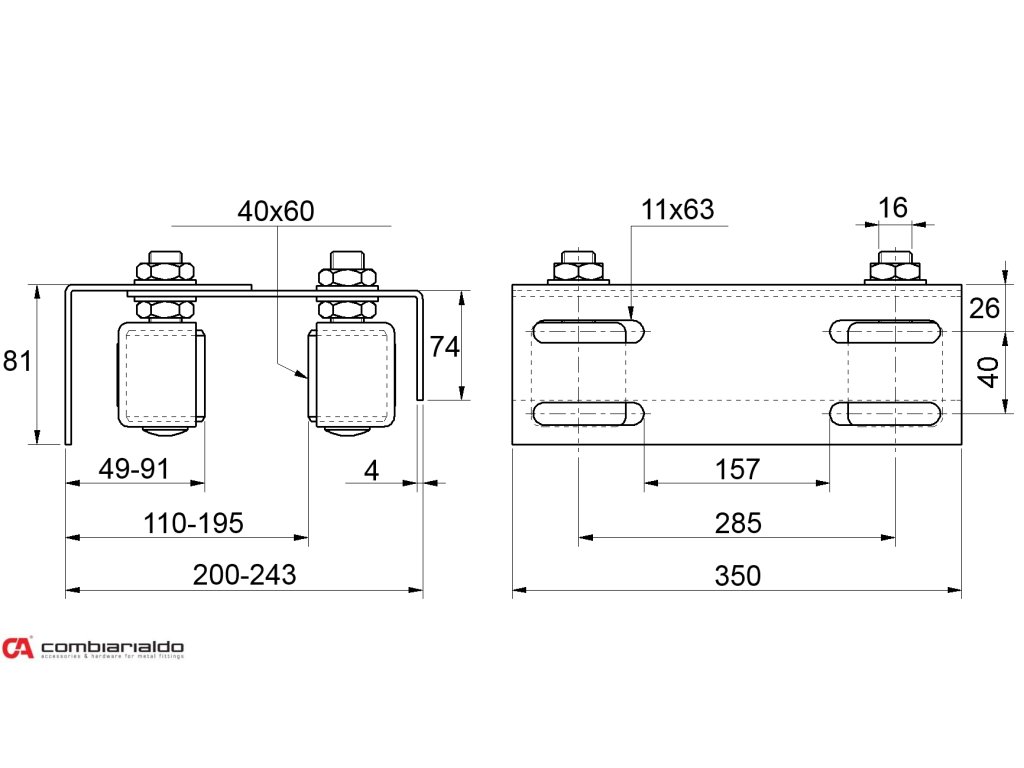 platňa Combi Arialdo, 4 vodiace nylon. kolieska 40x60mm, M16