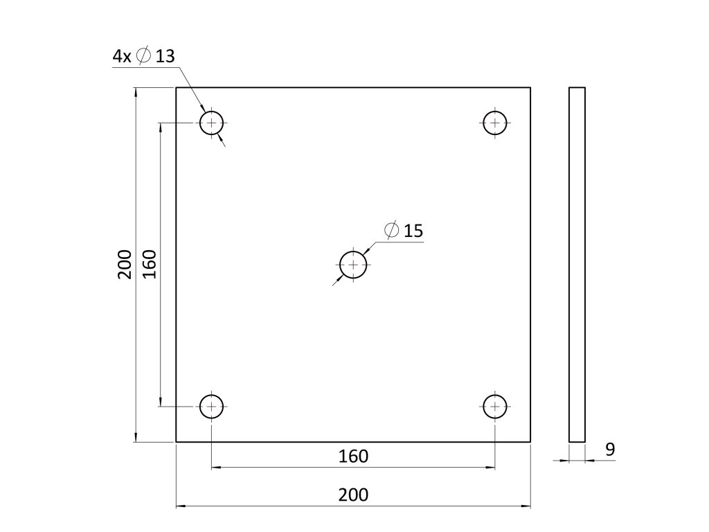 Platňa 200 x 200 x 9 mm s otvormi ø 13 mm, bez úpravy