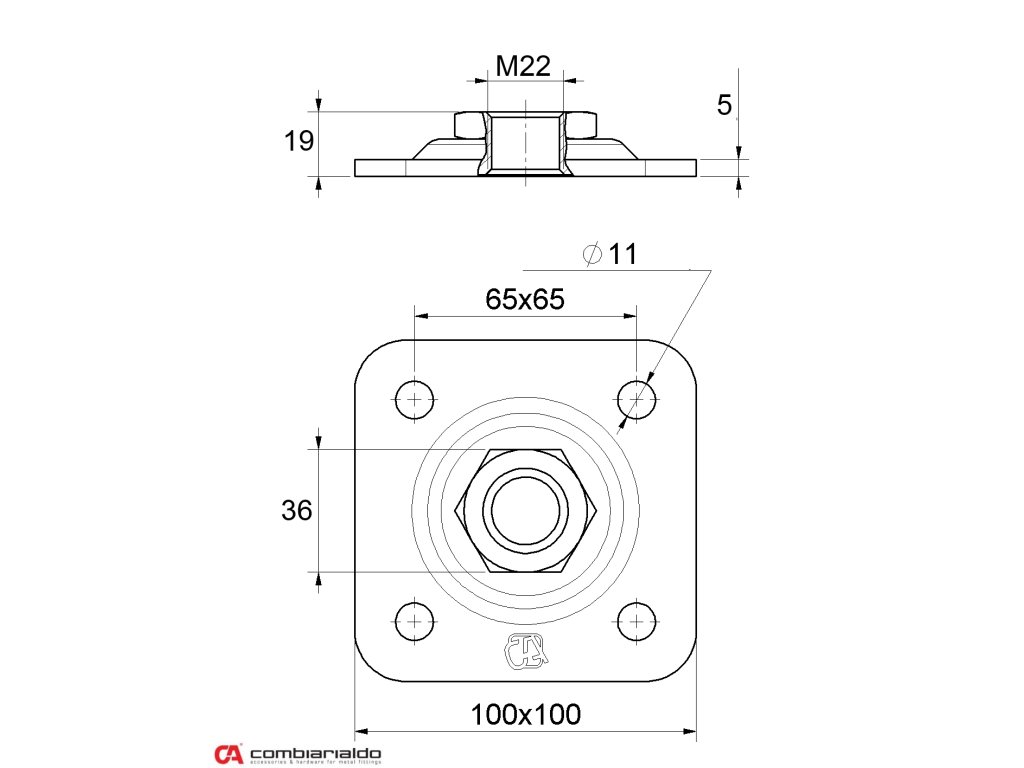 Kotviaca platňa v tvare štvorca 100x100 od popredného talianskeho výrobcu Combi Arialdo. Povrchová úprava- pozink, určená pre závitové úchyty M22 pre pevný úchyt do steny alebo na stĺp.