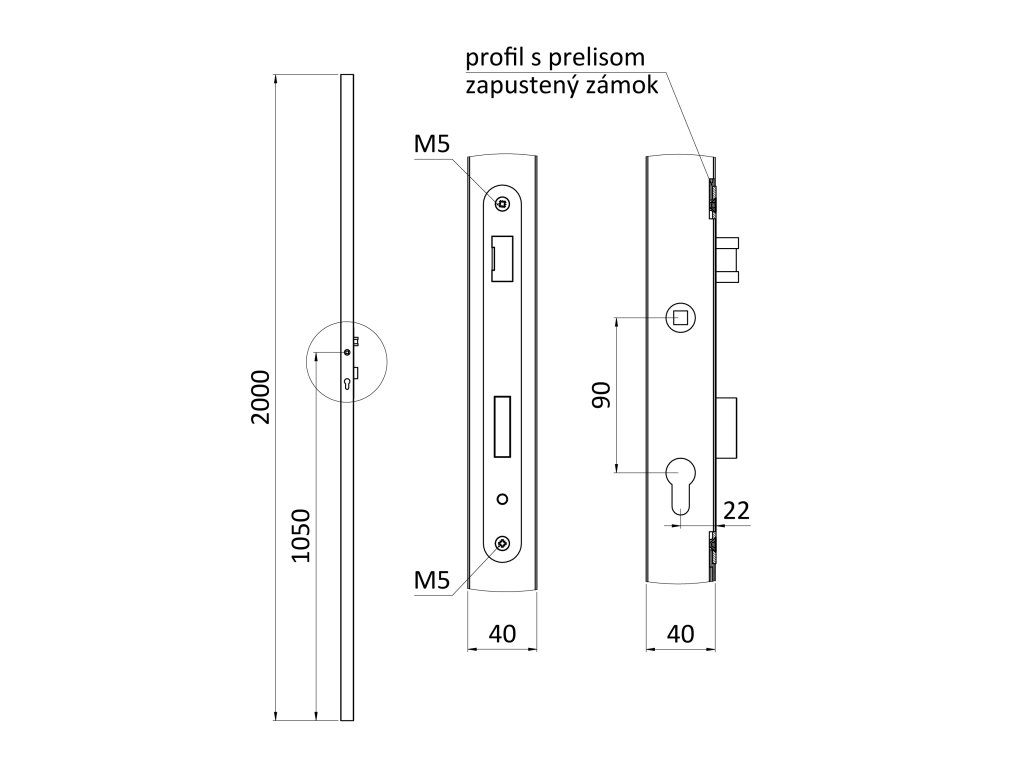 Profil 40 x 40 x 1,5 mm, výška 2000 mm, so zapusteným zámkom určeným pre rám bránky. Profil je dodávaný bez povrchovej úpravy. Zámok je obojstranný, vhodný pre pravé aj ľavé otváranie. Dodáva sa bez vložky.