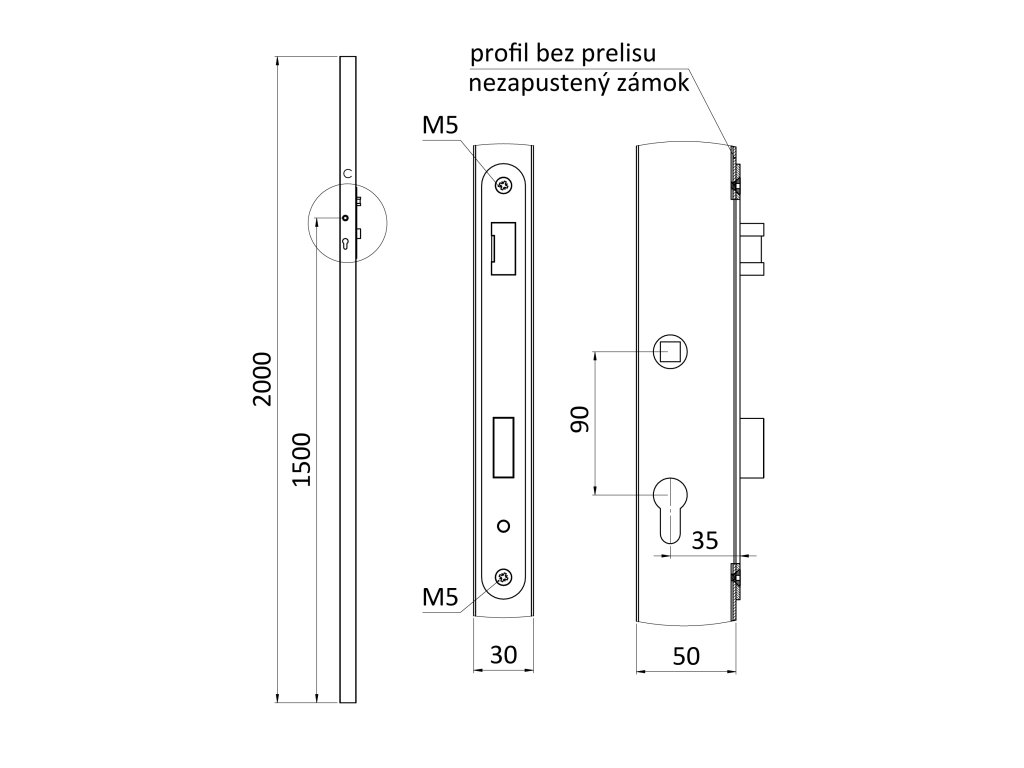 Profil 50 × 30 × 1,5 mm, výška 2000 mm, vhodný pre rám bránky. Profil je dodávaný bez povrchovej úpravy. Zámok je obojstranný, vhodný pre pravé aj ľavé otváranie. Zámok nie je zapustený a profil nemá prolis na jeho vloženie.