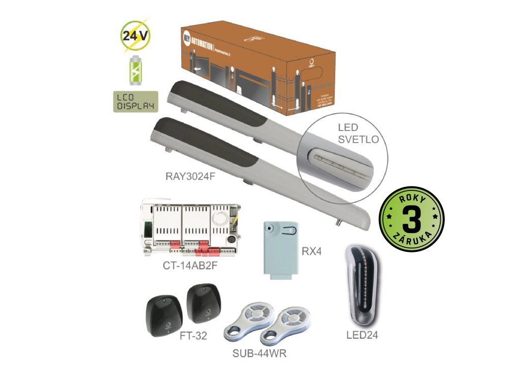 900KRAY3024FER - RAYKIT FASTLINE pre dvojkrídlovú bránu do 3m / krídlo, 2xRAY3024F (24V, 120W, 1000N), 2x SUB-44WR, 1x CT-14AB2F, 1xRX4, 1 pár FT-32, 1x LED24, potrebné 9 DYL pre programovanieVlastnosti: