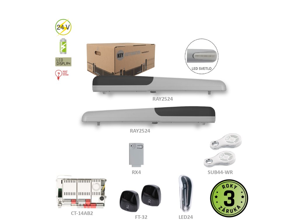 900KRAY2524ER - RAYKIT pro dvojkrídlovú bránu do 2,5m/krídlo., 2x RAY2524 pohon 24V, 85W, 1500N, 1x LED24, 2x SUB-44WR, 1x CT-14A, 1x RX4, 1 pár FT-32Vlastnosti: