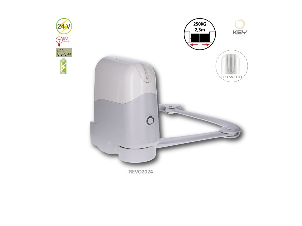 REVO pohon pre krídlovú bránu do 2.3m / krídlo, REVO2024S (24V, 140W, 120Nm) bez riadiacej jednotkyPákový pohon pre krídlové brány s maximálnou dĺžkou jedného krídla do 2,3 m.