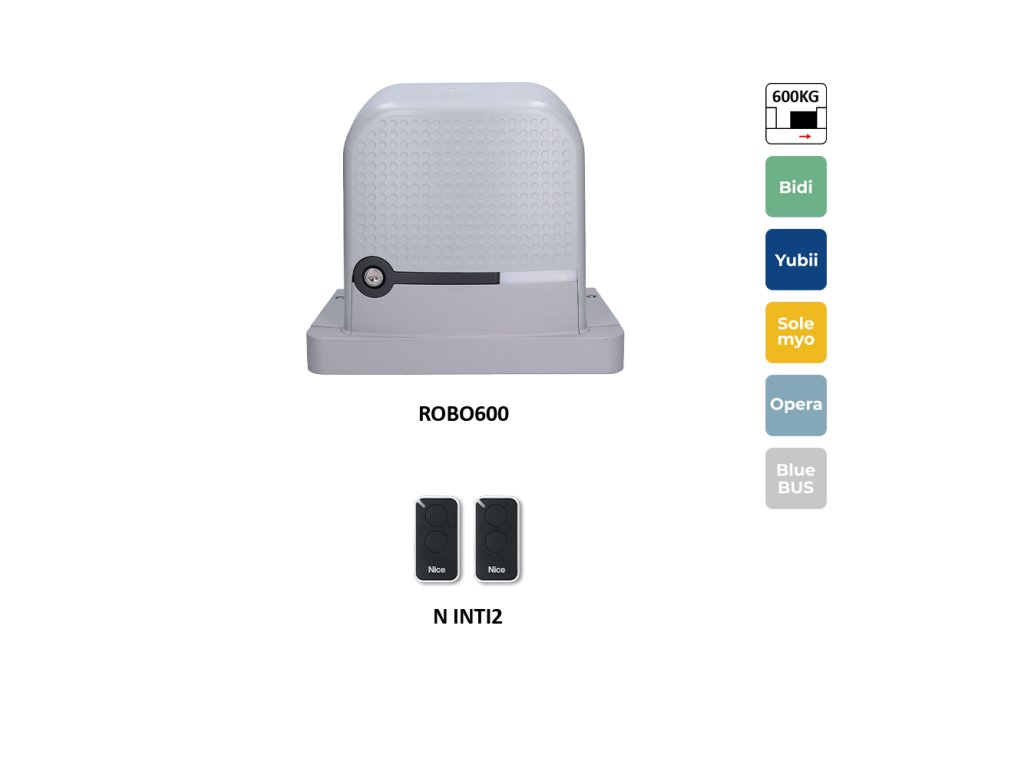 Sada pre posuvnú bránu do 600 kg, 1x ROBO600R10 (230 V, 300 W, 600 N), s zabudovanou riadiacou jednotkou, so zabudovaným prijímačom, 2x INTI2