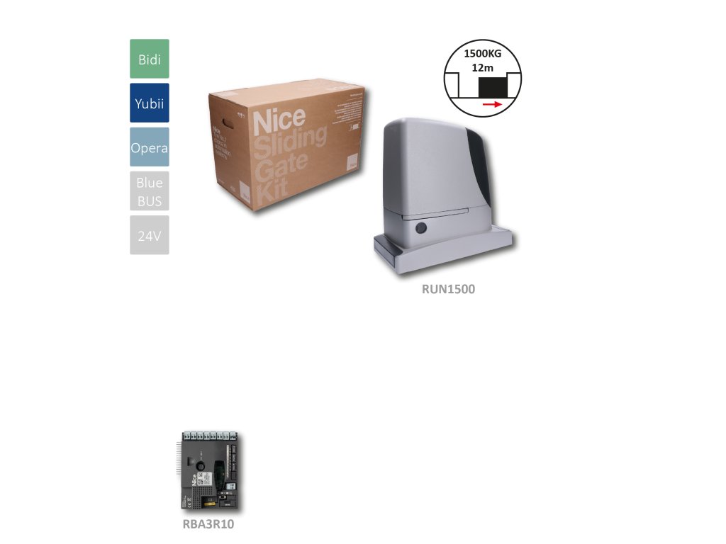 Pohon pre posuvnú bránu do 1500kg, 1x RUN1500 (24V, 400W, 1000N), 1x RBA3R10 BlueBus, spolupráca s akumulátorom PS124