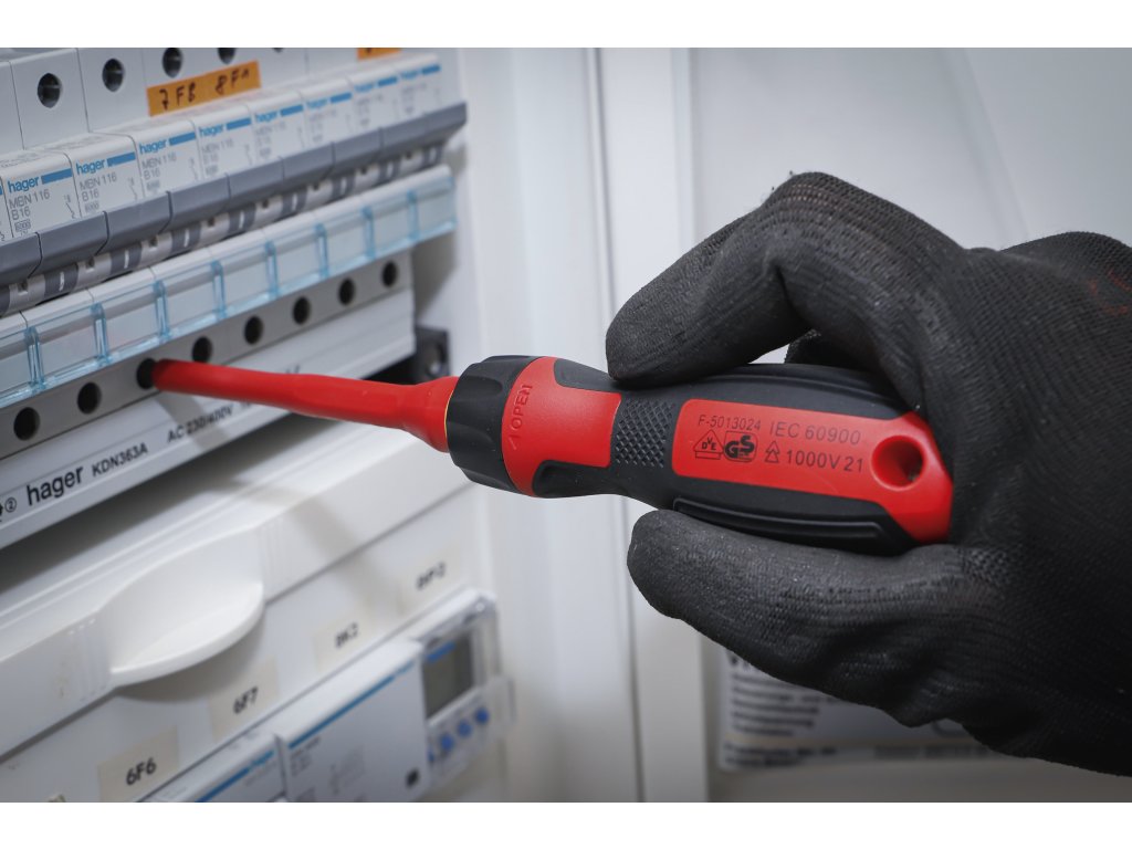 1 VDE rukoväť s držiakom na vymeniteľné čepele, s dvojzložkovou rukoväťou (červeno/žltá)