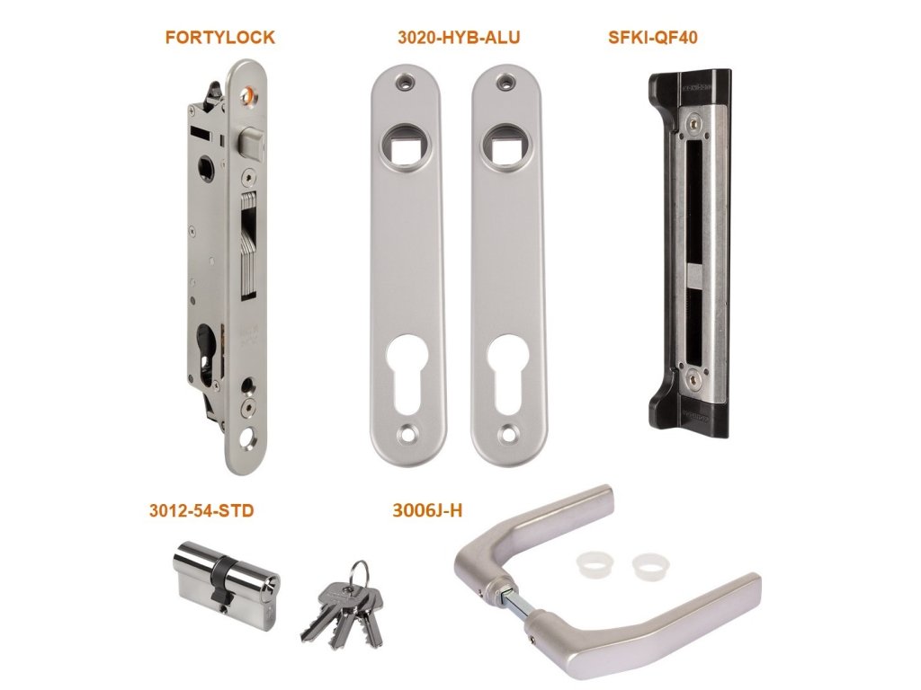 Kompletná sada na uzamykanie krídlových brán. Sada je univerzálna pre ľavé aj pravé krídlo a je určená pre použitie do profilu 40x40 mm. Sada obsahuje nerezový zadlabávací zámok, cylindrickú EURO vložku s tromi kľúčmi, hliníkové kľučky a štítky, dorazovú lištu. Zámok je nastaviteľný 10 mm.