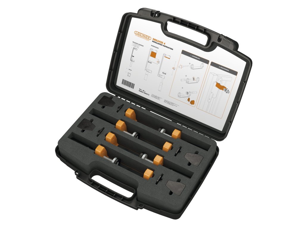 Praktická sada zosilnených oceľových svoriek na prípravu pred montážou (uchytenie a polohovanie montovaných častí na rám brány resp. na stĺpik). Náradie LOCINOX® DRILLVISE-4 ulahčuje prípravu a montáž závesov, zatváračov brány a iného príslušenstva.