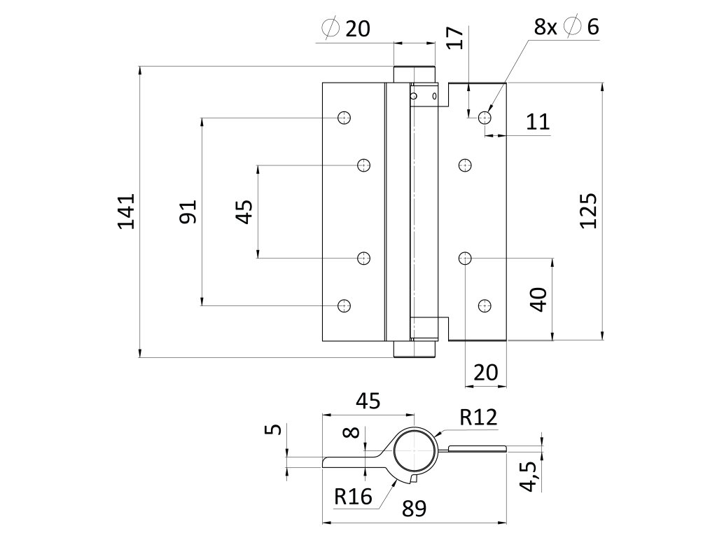 Predpätie pružiny a sila zatvárania je nastaviteľné. Doporučené maximálne zaťaženie: E1-P103-075: hmotnosť dverí 15kg, dĺžka krídla dverí 800mm E1-P103-100: hmotnosť dverí 20kg, dĺžka krídla dverí 800mm E1-P103-125: hmotnosť dverí 25kg, dĺžka krídla dverí 900mm E1-P103-150: hmotnosť dverí 30kg, dĺžka krídla dverí 900mmDodatočné parametre