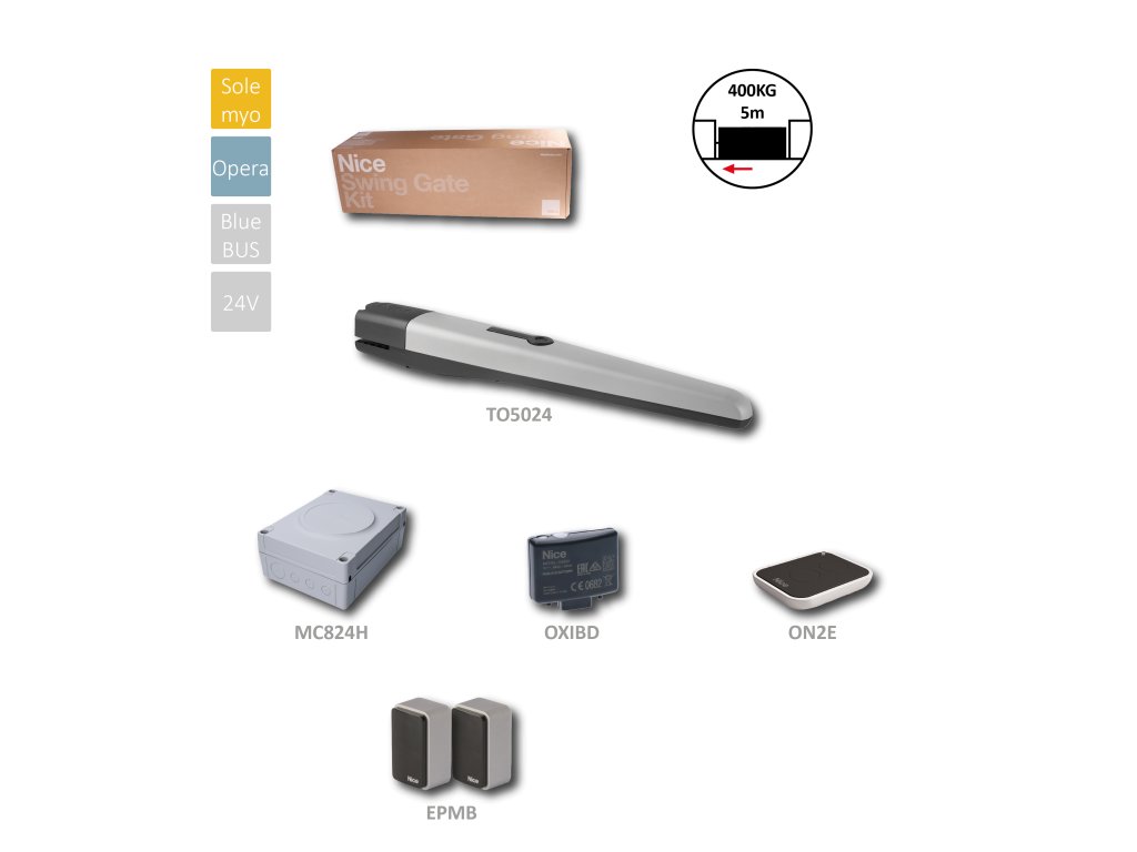 sada pre jednokrídlovú bránu do 5m/krídlo, 1x TO5024 (24V, 120W, 1800N), 1x MC824H, 1x ON2E, 1x OXI, 1 pár EPMBDodatočné parametre
