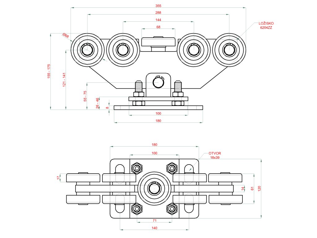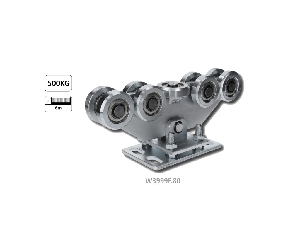 Vozík pre C-profil 80 x 80 x 5 mm výškovo nastaviteľný, 9 x oceľové koliesko s ložiskom 6204ZZ, galvanické zinkovanie