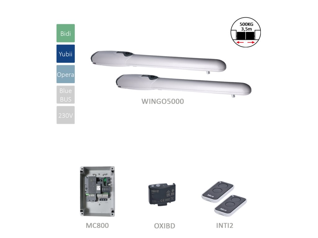 Sada motorov pre dvojkrídlovú bránu do 3,5 m/krídlo, 230 V, 130 W, 1700 N, 2x WG5000, 1x MC800, 1x OXIBD, 2x INTI2