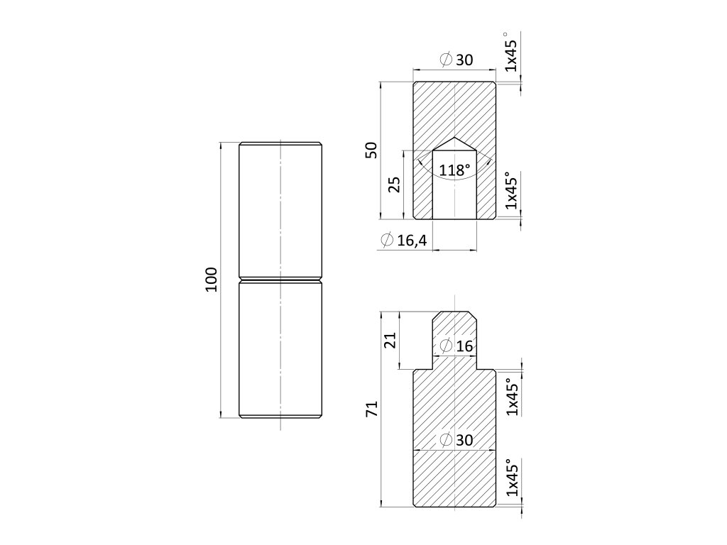 Záves bez guličky, ø 30 x 100 mm, bez povrchovej úpravy