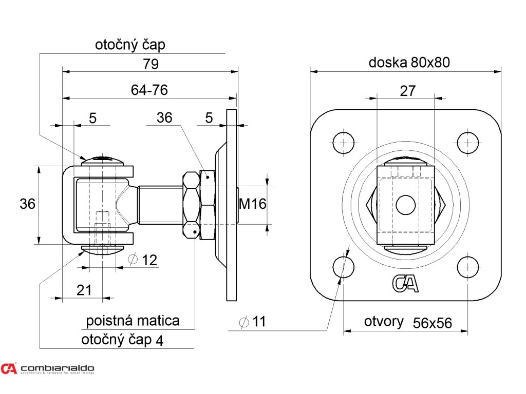 Záves M16 s platňou 80 x 80 mm, 90°, nastaviteľný 1D