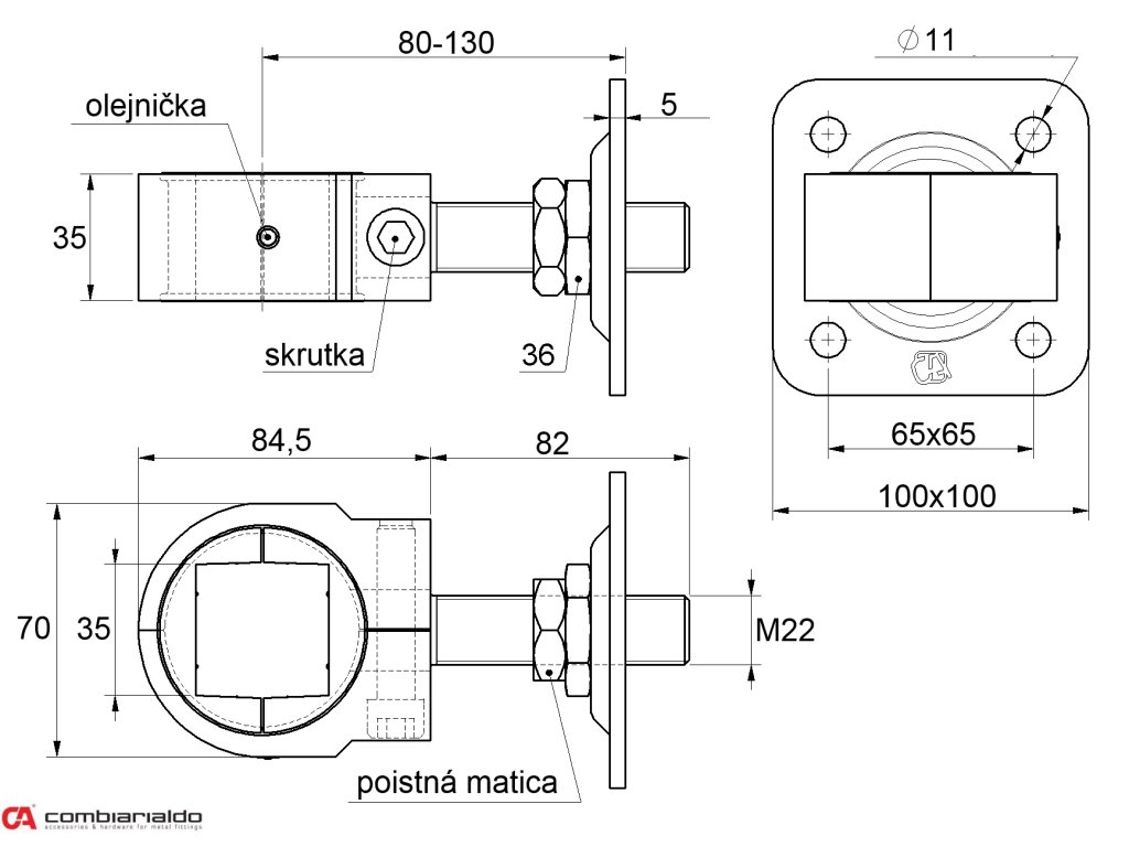 Záves nastaviteľný M22, pre 35 x 35 mm, platňa 120 x 120 mm