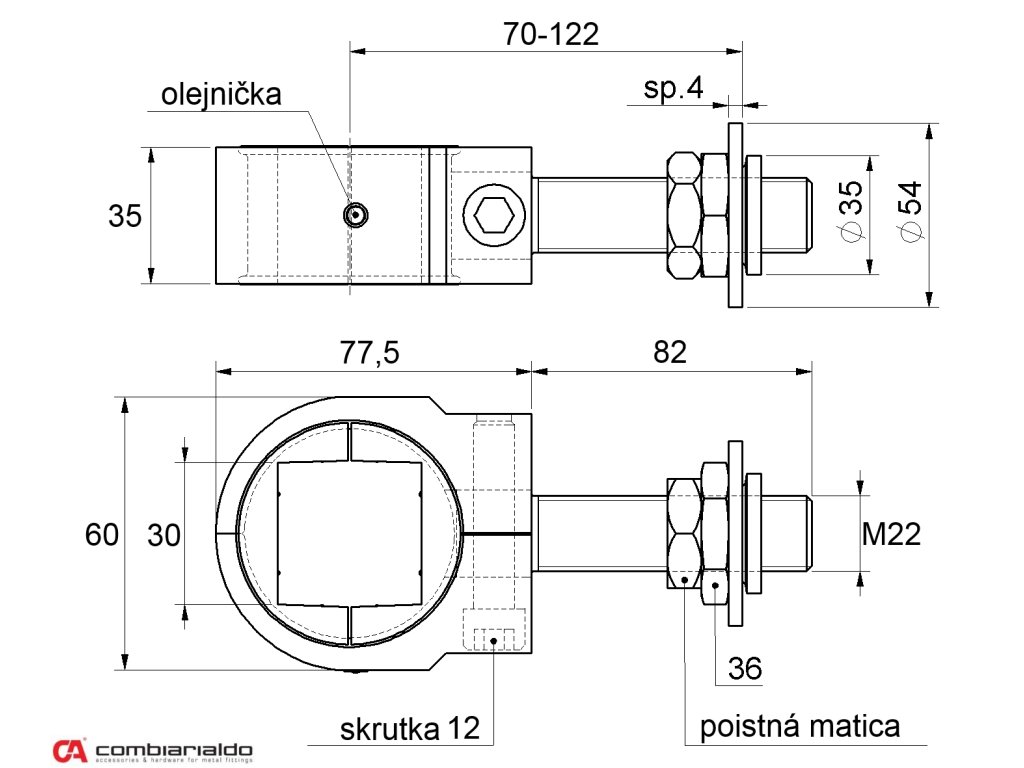 Záves nastaviteľný M22 na upnutie štvorhranu 30 x 30 mm