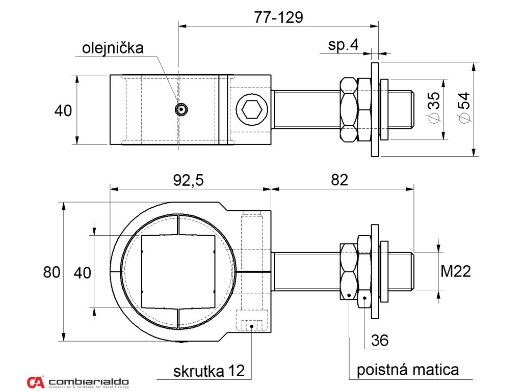Záves nastaviteľný M22 na upnutie štvorhranu 40 x 40 mm