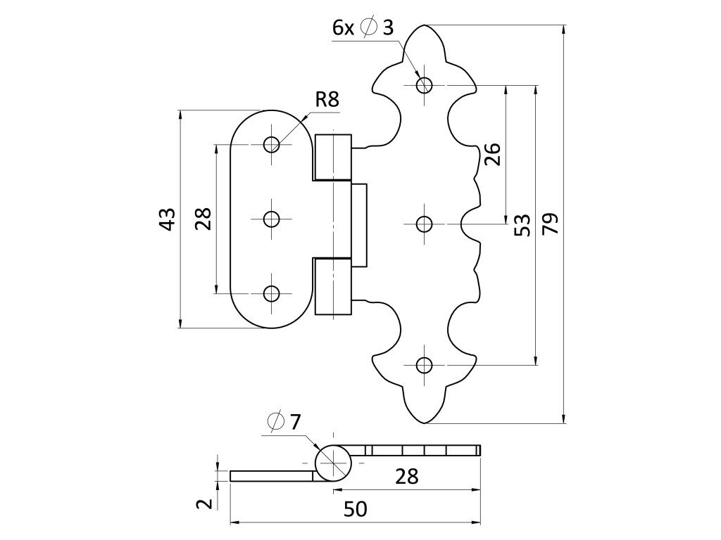 Záves ozdobný, povrch čierny lak, 79 x 50 mm
